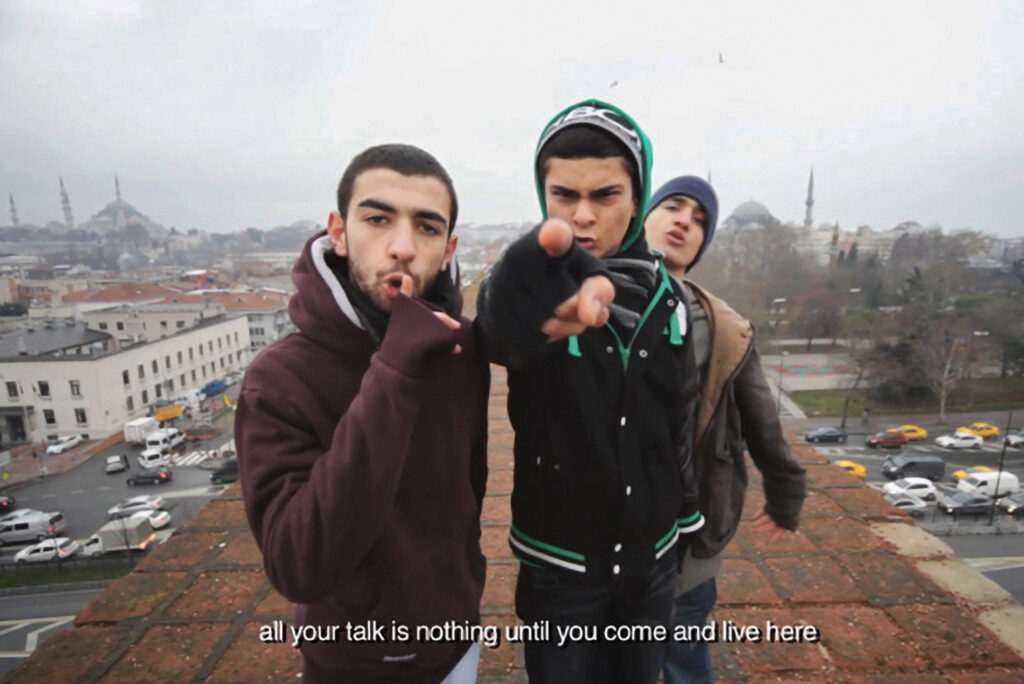 Wonderland, exhibited at LB01, documents the anger, resistance, and hope voiced by a group of youths from the Sulukule neighborhood of Istanbul that has been the home of Roma communities for the past six centuries. This historic area started to be demolished in 2006 as part of an “urban renewal” development project. Despite the prosperity promised by the Housing Development Administration, apartments built in place of the demolished neighborhood have ended up serving nothing more than social inequality, poverty, and infrastructural problems. The deep-rooted lifestyle shaped with music and dance of the people of Sulukule faces oppression and irreversible corrosion. Presented in the style of a music video by the hip-hop group Tahribad-ı -syan, Wonderland captures how one subculture, hip-hop, can flourish and live within another culture, Roma. The band raps about inequality and gentrification while simultaneously being confronted by the police.