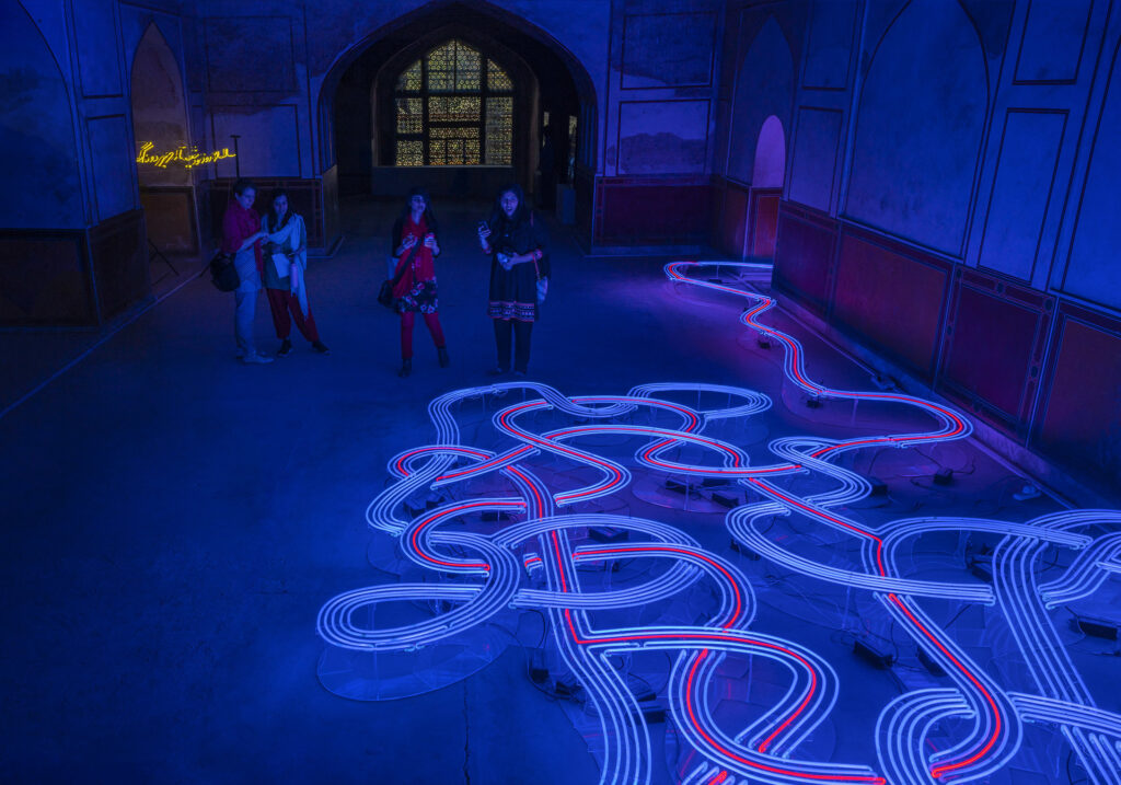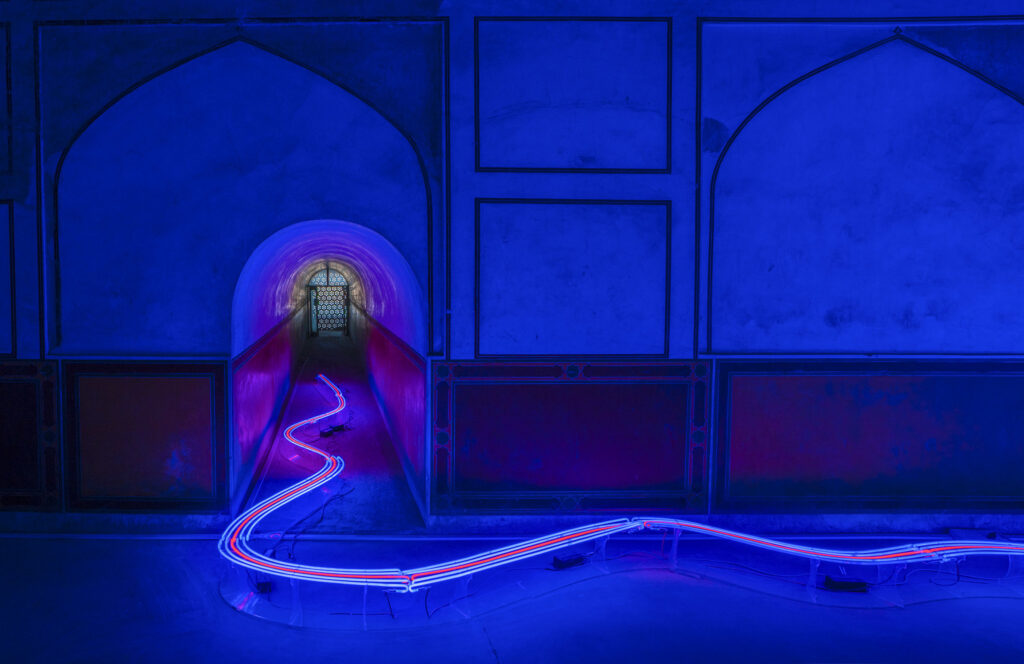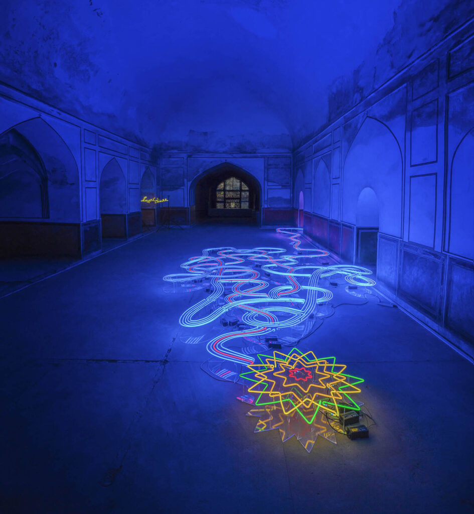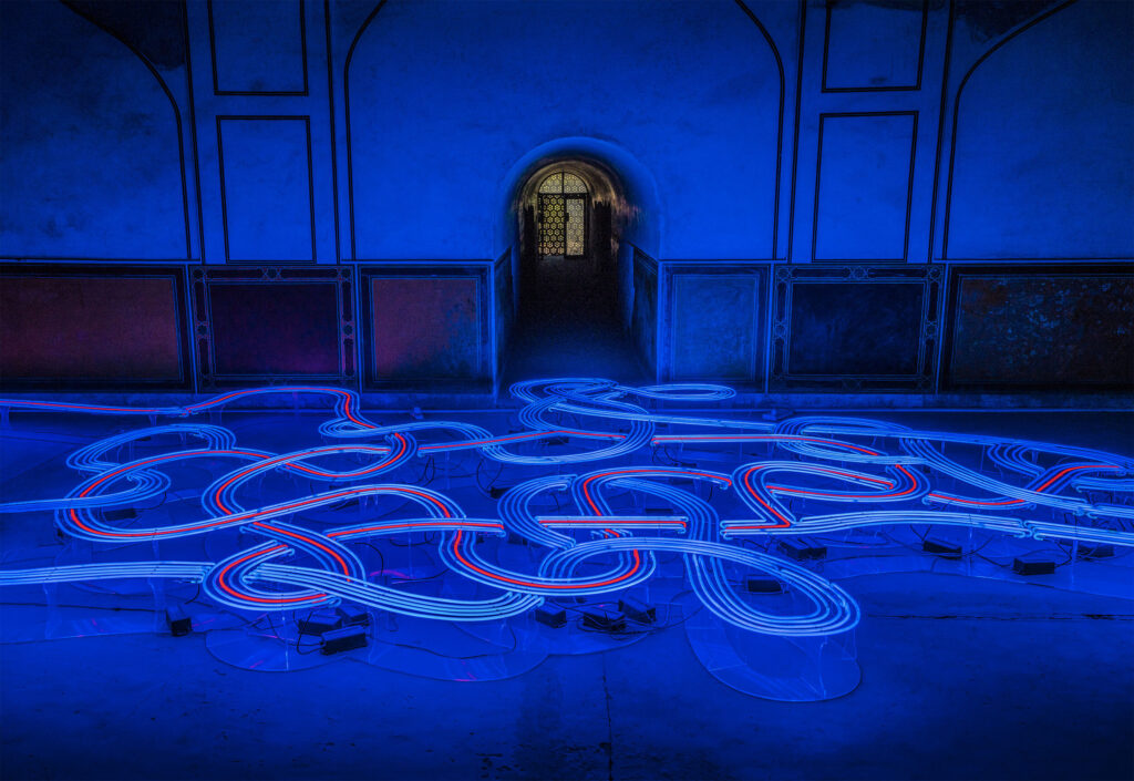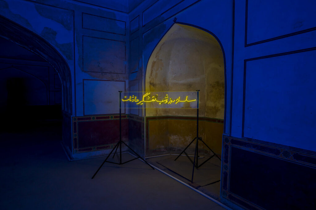 خاص طور پرل بی ۰۱ کے لیے تیار کیا گیا، روز او شب (دن رات) ایک سائٹ کے لیے مخصوص نیون انسٹالیشن ہے جو اس گرفتاری کی جگہ کے تاریخی حوالوں اور حسی مقابلوں کا جواب دیتی ہے۔ نیلے نیین کے الجھے ہوئے “دریا” کو سرخ رنگ کے ساتھ تھریڈ کیا گیا ہے، جس سے بھولبلییا کا پتہ لگانے والی آنکھ ایک کامیاب راستے کے ساتھ روزمرہ کے باہر اور اندر کی حد کو ختم کرتی ہے۔ روز او شب کی ترتیب مغل فن تعمیر (بھول بھولیاں) میں بھولبلییا کے ڈھانچے اور دوسری جگہوں پر یکساں قلعے اور محل کے فن تعمیر کو یاد کرتی ہے۔ بچوں کی پہیلی کو مغل فن تعمیر کی ریاستی حیثیت کے ساتھ مکمل طور پر جڑے ہوئے شکل کے ساتھ پیش کرتے ہوئے، روز او شب اس وقتی فاصلے کو جنم دیتا ہے جو مغل ماضی کو ہمارے عصری حال سے الگ کرتا ہے۔