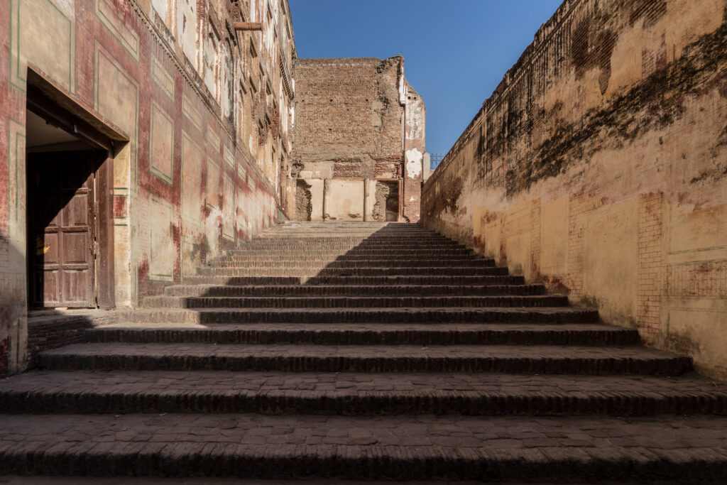 Constructed by the sixth Mughal Emperor during the 17th century, the Summer Palace was built as a seasonal retreat for the Royal family. Located at the basement of the Shish Mahal of the Lahore Fort, the Summer Palace is a space in which interiors and exteriors blur, where night and day seemingly meld together. This character lends itself to suggestions of rendezvous and intrigue in present-day folklore. For the purposes of the Lahore Biennale 01, the unique architectural features of this site present noteworthy curatorial possibilities. A concern with interiority characterizes many works exhibited in the Summer Palace. Shirin Neshat and Rehana Mangi’s works comment on the experience of women’s life in the region. Historically, public silence has been a feature of female lives in this part of the world. This is powerfully addressed in Neshat’s video where a man sings beautiful renditions of a poem by Jalaluddin Rumi, but when the woman sings her voice does not align with the movements of her lips and she sings in an unintelligible language. Trained as a miniaturist, Rehana Mangi brings her meticulous precision to her textile work but alters this by introducing human hair as an integral feature of the artwork. Hair symbolizes desire, and also a marker of shame in the public presence of female bodily experience. Shahpour Pouyan and Sadia Salim engage with diverse elements and motifs from Indo-Persian court paintings. The conscious erasure of figurative forms in Pouyan’s paintings questions commonly accepted narratives of history. In Sadia Salim’s work, the geometrical pattern in Islamic architecture is miniaturized and rendered as ligree in translucent porcelain. In Hamra Abbas’ work, images that are part of collective memory are re-examined through color separation, in order to “deconstruct the act of seeing.” Nadia Kaabi-Linke’s sound work creates an aural register that captures present day anxieties. Twitching limbs and restless legs are surely a marker of our accelerated era as we are affected by the various stresses of modern day life. Meticulous record-keeping, classification and observation across time is evident in the works of Naiza Khan, and Fazal Rizvi. Each artist works through the legacy of colonialism in the region, noting its impact on geography, ecology, terrain, flora and fauna of the region, during, and after British rule. Huma Mulji records small exchanges that often go unnoticed against the backdrop of an increasingly urbanized society; in her work we are made privy to small gestures shared between the artist and a local bread seller in Lahore since 2010. Amar Kanwar’s video installation is a sensorial undertaking that moves from light into darkness. The film addresses a disintegration of the senses, as well as the nature of collective history. In its slow unfurling, the film comes into dialogue with the photographic work of Firoz Mahmud who turns our focus onto yet another kind of blindness. Bangladeshi textile workers wear extraordinary optical devices fashioned from the textile machinery itself. Here, rather than served by constant labor, the machine is now used to create seeing devices. The workers temporarily attempt to assume the role of viewer, versus that of the one being subjugated. Referencing the labyrinthine nature of the basement structure that has a sophisticated hydraulic system, Iftikhar Dadi & Elizabeth Dadi’s neon work evokes a space situated in endless temporality, in which time assumes a fluid character—and also the Ravi river that once flowed in close proximity. Verses from the poetry of Muhammad Iqbal that reference a “two-silken twine” suggest here the red and blue neon paths as manifestations of the cycle of night and day, tangled in one another as they beckon us to reflect on our relation to deeper history.