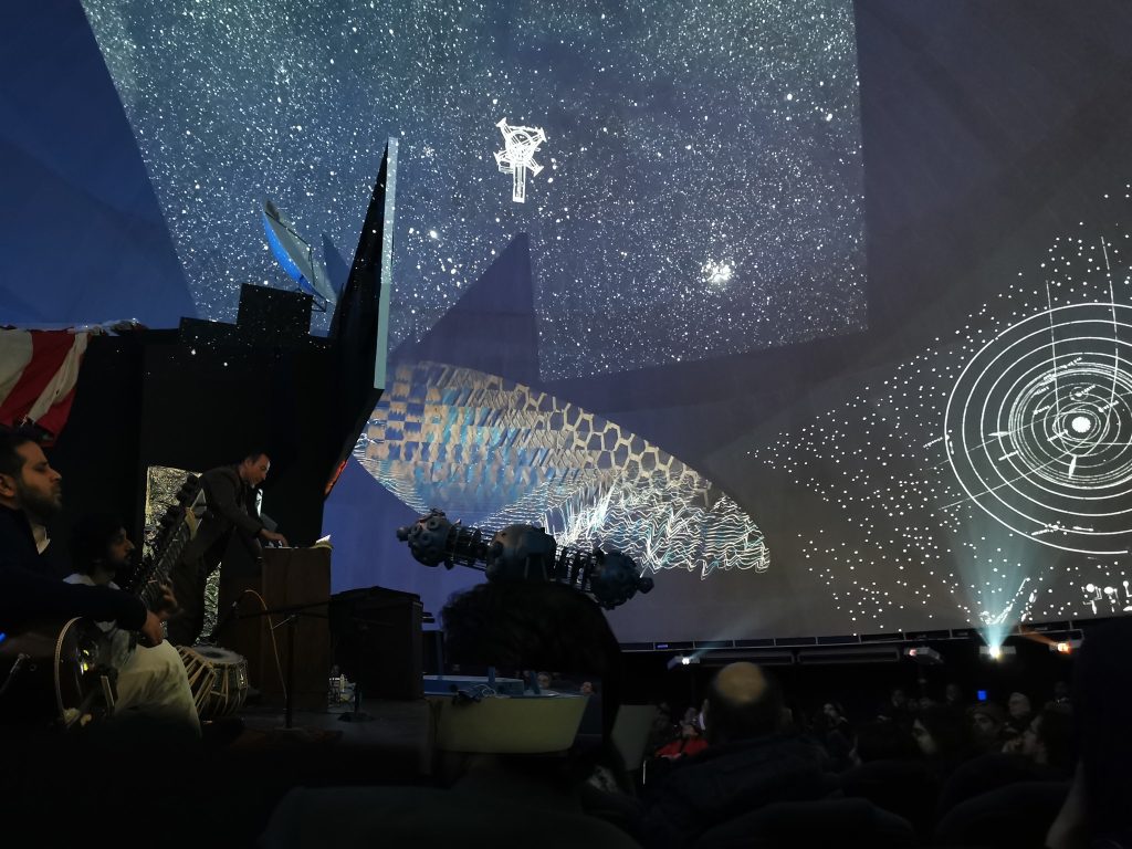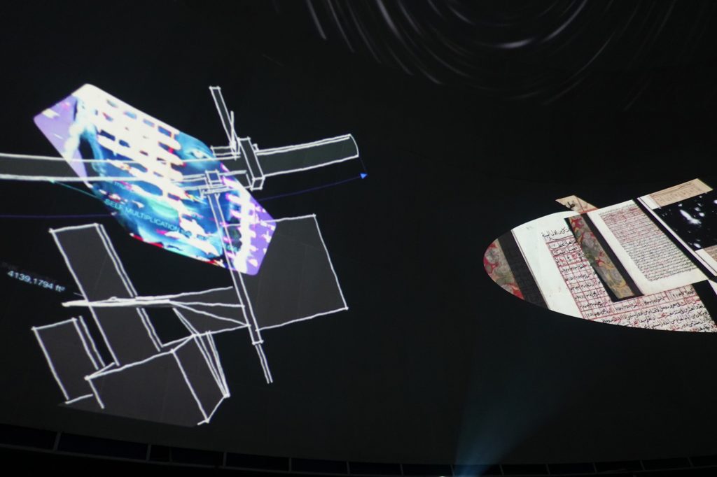 An orbital observatory of a site-specific multidisciplinary installation invites the viewer to PIA Planetarium of Lahore. Comprising of a ten screen video with quadrophonic sound and 360-degree drawing installations, this satellite formation presents the collaboration of three artists and their reflection upon the life of the Astronomer, the Great Ruler of Samarkand Sultan Mirzo Ulugh Beg. His legacy includes a 15th Century observatory that is represented by an artistic video and photo monitoring from the heights of conceptual orbits and depths of the utopian/dystopian skylines, fictional architecture and landscapes. The scattered episodes and non-linear chronologies, juxtaposed with medieval empiricism and the latest cosmological models, are constructed into “alternative realities” and turned into radiant rays of multi-sensorial documents and imaginary objects, pixelated by space debris and the industrial pollutions of modernity. Accompanied by a real-time performance with electro-acoustic and musical experiments that touch upon the rare subjects of musical intervals, with xenharmonic scales, this project is reestablishing the longstanding cultural ties of ancient Maveranahr with the Mogul Empire.