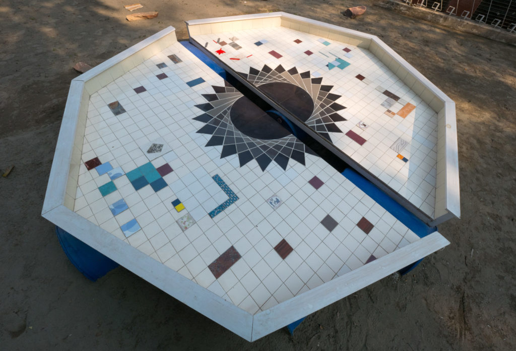 I Can Drink Stars is a sculptural intervention located on the ruined miniature model of water management of the Ravi River, which is itself situated on the grounds of Punjab Government’s Water Irrigation Department in Lahore. The installation examines the shared history of contested rivers and the entanglement of coloniality with cartography, extractive economies, and geological surveys. The focal point of the installation is an octagonal pool. The octagon as a stable geometric form, one that the ancient Persians believed kept water pure, and project symmetry and balance in the spiritual habitat of Persian gardens. Behbahani chose to split the pool in half, which evokes uncertainty and division, and examines the possibility of undoing. Mounted on plastic barrels, the pool suggests a floating vessel to be used in the event of an emergency due to flooding. Reimagining the fragments of cultural heritage and contemporary everyday life, the pool’s interior is surfaced with patching variety of tiles sourced from local construction projects. I Can Drink Stars encompasses the philosophical, the geopolitical, social and the ecological. It weaves these associations together and raises questions for the future of creative resistance and environmental justice