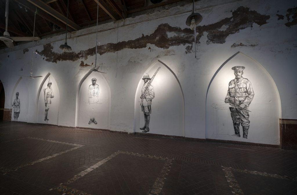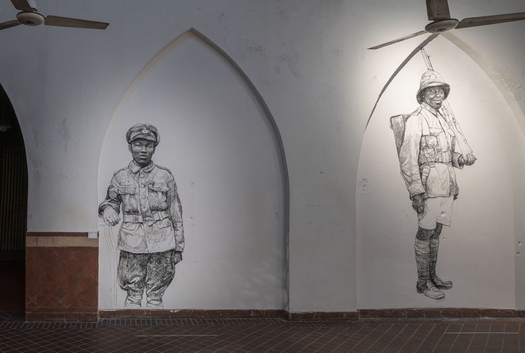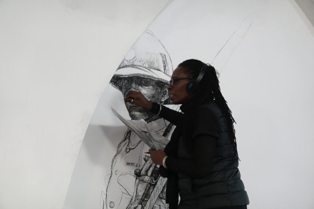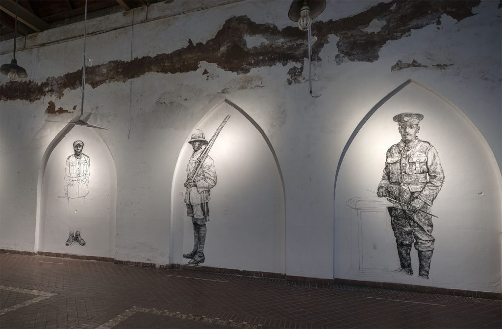In Alchemy the British artist Barbara Walker addresses issues of race and segregation in the military. This new series of site-specific, large-scale wall drawings depict soldiers from the Commonwealth in World War I. Acknowledging the contribution of Black servicemen and women to British war efforts is a key concern in Walker’s recent work; she attends to a prevailing absence of representation in our museums and archives, and a missing opportunity to celebrate, respect and remember. The use of erasure and the void within her images signifies what she sees as a gap in the collective consciousness of a nation. History is central to Walker’s practice. In common with her wider body of work, Transcended looks to redress the story with a broader perspective, giving voice where before there was none. Walker references the role of Black soldiers in the First World War, and the thousands of West Indians who volunteered to fight with the British army. Fearing the consequences of empowering Black servicemen to engage and kill a white enemy, the British Government in 1914 initially kept Black soldiers off the frontline and deployed them instead for menial tasks such as digging trenches and moving artillery shells. Once the staggering losses became apparent, the policy changed and Black soldiers were swiftly deployed to fight in combat from 1915. Made in charcoal and ephemeral in nature, Walker’s drawings are striking and bold. They portray soldiers from the British West Indian Regiment who died and were buried in graves in Taranto, Italy, following a mutiny that lasted four days in December 1918. Poignant and affecting, they reference current and recent British conflict alongside historical events of warfare involving Britain and the colonised nations of the British Empire