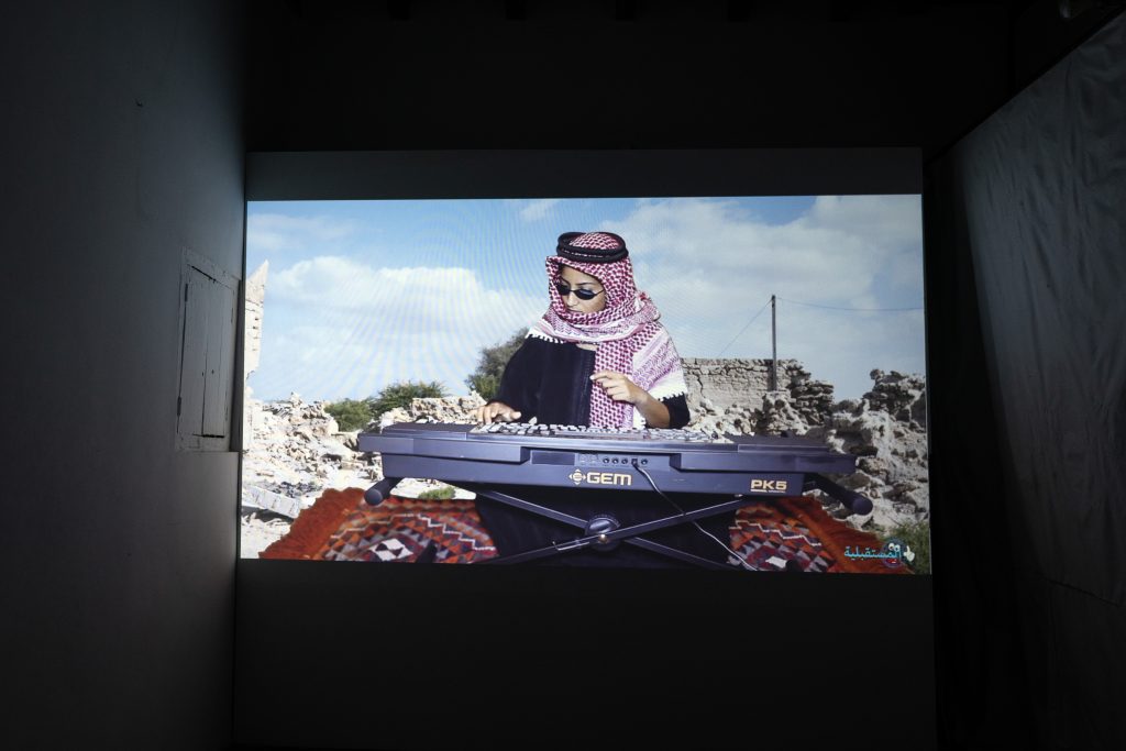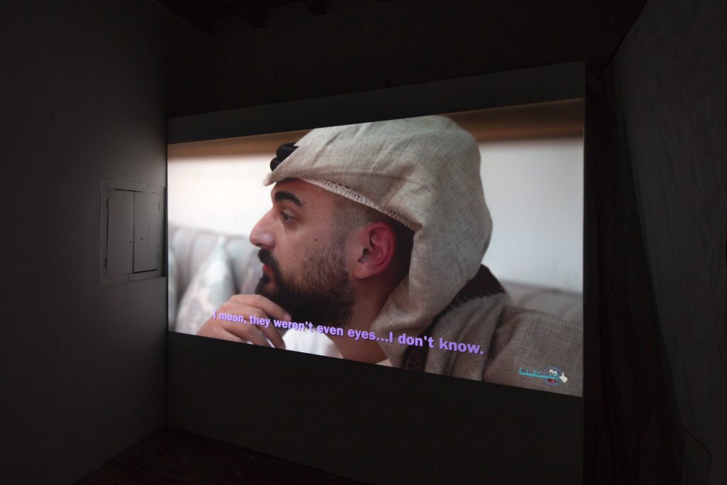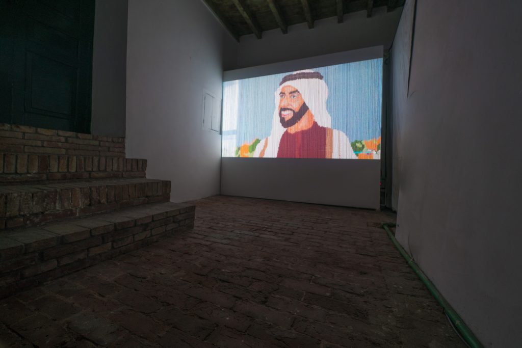 In her debut short film, Um Al Naar, Farah continues her exploration of the body in new and provocative ways. The film is a mock documentary on a fictional reality television channel called “Future TV” in which producers interview a mythical Jinn character named Um Al Naar about her experiences in Ras Al-Khaimah. The Jinn is covered in layers of floral cloth and no part of her body is visible. Only a rudimentary face is sewn on the front and she holds a glass of tea as she chats casually to the audience. In this comic combination of “Sesame Street” meets “state sponsored documentary,” we come to hear Um Al Naar’s rendition of the transnational history of Ras Al-Khaimah and her complex sense of belonging to it.