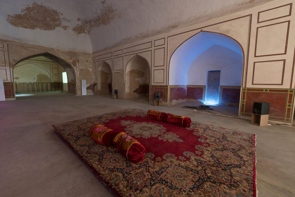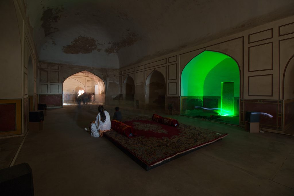 ہارون مرزاکیتنصیب آواز،روشنی کی لہروں اوربرقی کرنٹ کےدرمیان باہم تعامل اور ِگھساؤ کو جانچتی ہے۔ وہ ایک مداخلت کے حامی ہیں، (برقی-صوتیاتی یا ریڈیائی خلل اندازی کے معنوں میں)، وہ ایک ایسی صورتحال پیدا کر دیتے ہیں جو بامقصد طور پر تاروں سے تاریں ٹکراتی ہے۔ وہ اپنا کردار ایک ایسے کمپوزر کے طور پر بیان کرتے ہیں جو بجلی کے ساتھ جوڑ توڑ کرتا ہے ۔ ایک براہ راست، غیر مرئی اور سیماب صفت مظہر، جو اسے ایک مختلف دھن پر نچاتا ہے۔ مرزا ہمیں شور، آواز اور موسیقی کے حسیاتی ادراک پر نظر ثانی کرنے کا کہتے ہیں، اور ثقافتی ہیئتوں کی زمرے بندیوں کو دائرۂ سوال میں کھینچ لاتے ہیں۔