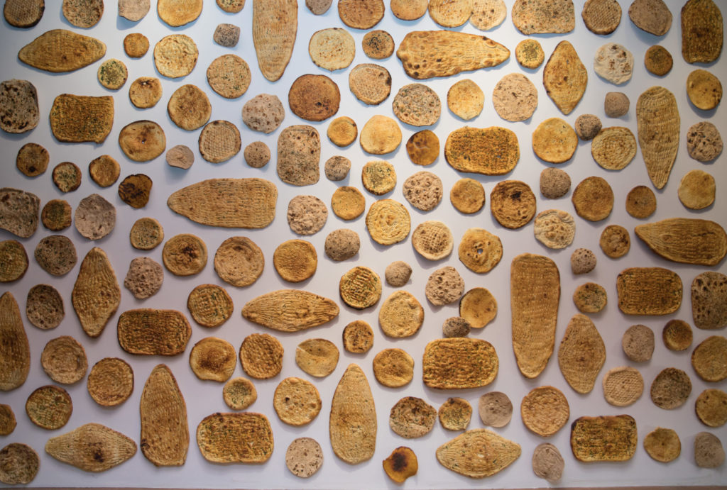 “Upon my travels to different parts of our continent, I was fascinated by how the idea of bread evolves throughout Asia. Hence, the work embodies a documentation of bread from Central-Asian to South-Asian region. It follows a narrative of food culture through the representation of fermented and non-fermented bread, and helps draw parallels between the duality of the nature of the bread and the culture inhabiting it. The work is a comment on the culture of the local region through the circulation of bread across various cultures and how the form and function of it changes in terms of size, taste and even the meaning of bread itself.”, Imran Ahmad Khan.
