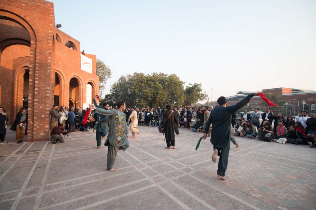 Peraan-e-Tombaan (Pant and Shirt) is a performance-based video installation where a group of dancers appear to be dressed in traditional Afghan men’s clothing, a combination of loose pants and a wide, knee-length shirt with an embroidered yoke. The costumes are in fact stitched from fabric used for military and police uniforms, and the embroidered pattern is made up of a combination of military insignias.