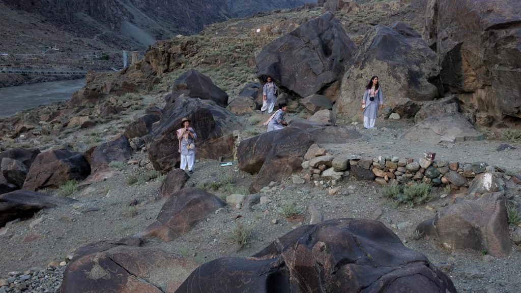 Ostensibly benign, proper and ‘pure’: women painters dressed as air hostesses enter sites built by powerful men to generate energy on a massive scale – only to subvert the logic of ‘patriotic’ economic development. Saba Khan, Amna Hashmi, Malika Abbas, Natasha Malik, Emaan Shaikh, and Saulat Ajmal are the Pak [pure] Khawateen [women’s] Painting Club. In this project, they venture to the frontier of the Indus river for ‘plein-air’ painting of nationalistic projects: the mega hydropower dams in the north. Female painters stereotyped as a benign, bourgeoisie group, but in uniform (inspired by Peirre Cardin’s design for Pakistan International airlines in the 60s) subvert roles and enter sensitive sites built and imagined by powerful men to generate power and energy for the nation. Drawing from the book, ‘River of Fire’ by Qurratalain Haider, complex narratives weave a temporal history of people who are united around water bodies. The Indus waters host strata of history. Its deities, rituals, supernatural powers and folklore transcend religion and time, who protect subaltern cultures. In an attempt to tame its waters with modern engineering for agricultural output maximization, the fragmentation of the river, resulted in displacement of indigenous populations, unequal division of resources and inundation of histories. The multi-layered project will create links between femininity, masculine power, water structures, folklore, magic, colonial and neo-liberal designs. As provocateurs, we will question and aim to open the conversation about who’s right is to be considered of greater importance – the urban centres, the subaltern indigenous, or the earth itself.