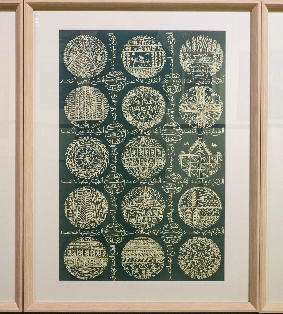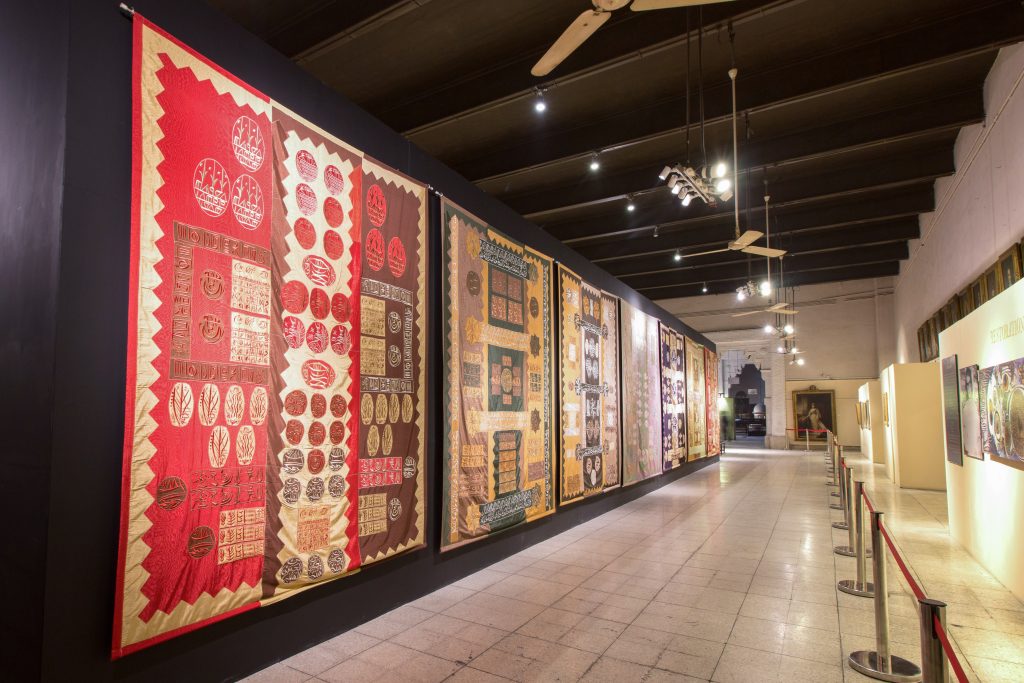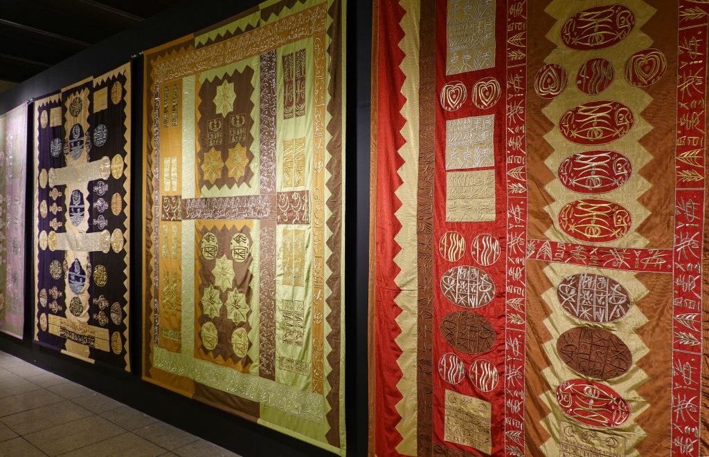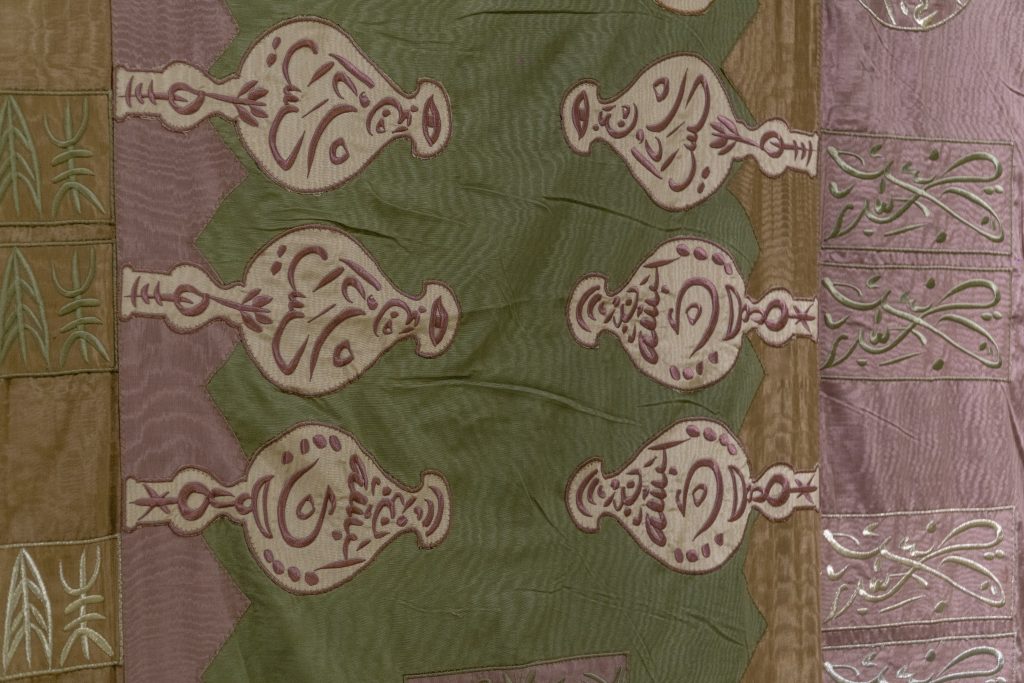 ‘ The silk tapestries represents the primary element for me. The atmosphere created by this forest of banners shows the presence of all the invisible ancestors as in the prehistoric circle. The abundance of signs, symbols, inscriptions create an air filled with prophylactic talisman, magical and eternal like a type of blessing and protection for all those who would come to lose themselves among these refined and significant fabrics. Out of respect for the three revealed religions, I voluntarily selected three different colours of silk for each flag, embroidered in three different colours of silk thread.’ Rachid Koraïchi