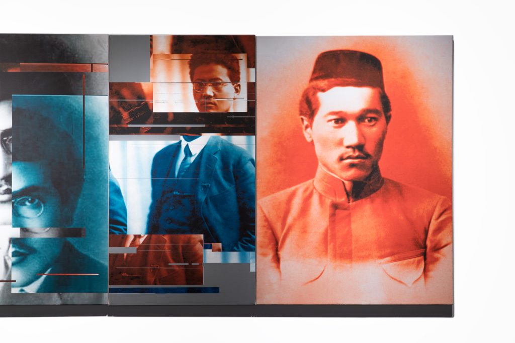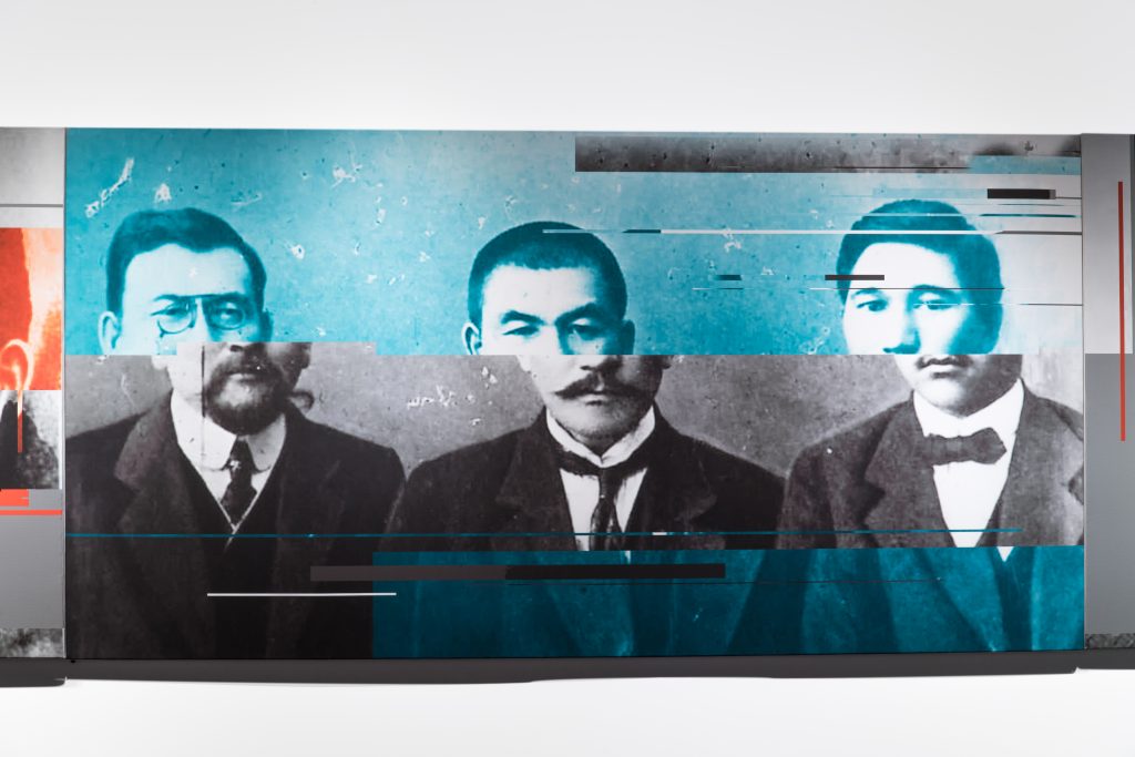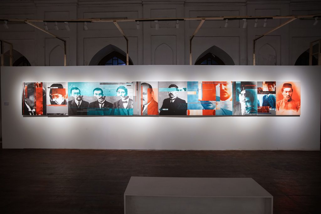 Syrlybek Bekbotayev’s “Red Filter” series focuses on one of the most tragic periods of history of Kazakhstan. The Stalinist Terror of 1930s claimed millions of lives but most importantly set into motion the ideological machinery for memory erasure. Hundreds of names of purged intellectuals were forgotten for decades and historical narratives got ‘distorted.’ This distortion and numerous ruptures of memory and history become the core of the series where Bekbotayev depicts many of the victims of the Great Terror – the first generation of Kazakh political and cultural elites of Alash party. The artist downloads portraits of these intellectuals, writers and politicians from the Internet and then deconstructs each image along the horizontal and vertical lines to demonstrate the continuous distortion. While these faces are emblematic for contemporary Kazakhstan they also symbolize the seventy years of generational and historical cultural amnesia. Little is known about the fate of these intellectuals after 1937 and most of these biographies end with the following: “perished,” “repressed,” and their burial sites remain unknown. What is left of them are their works and their portraits. Bekbotayev uses the pictorial distortion of the image as a critical reflection of the cultural amnesia and totalitarianism. The ‘red’ filter symbolizes the Communist filter of the twentieth century. Most of the portraits Bekbotayev presents are recognizable by the Kazakhstani citizens who also immediately see the ‘distortions.’ These distortions also represent different ideas to different audiences – both the Communist past but also the current political and historical attitude towards history of Kazakhstan and its most tragic periods.
