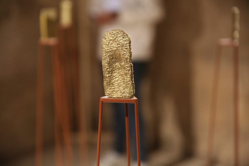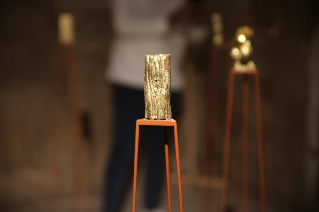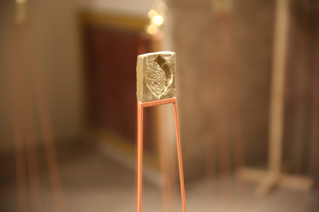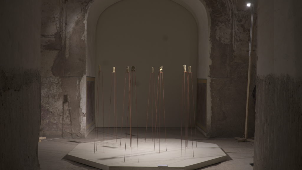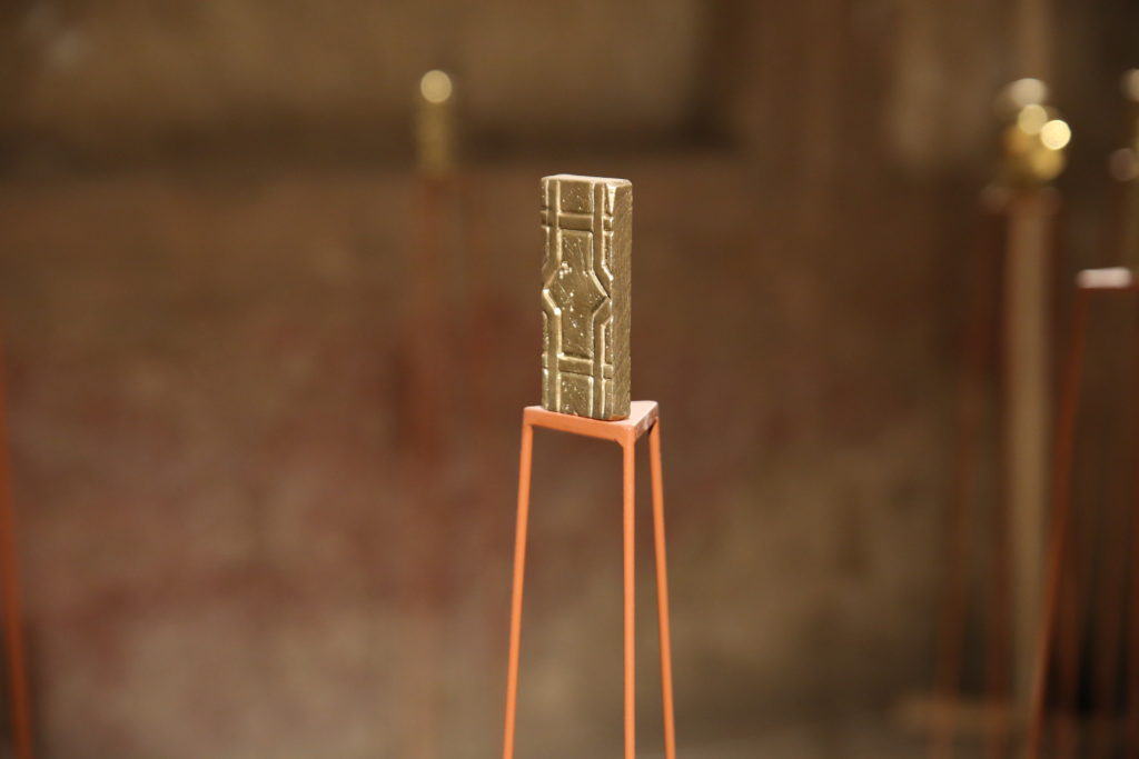 Taus Makhacheva’s Seismic jitters, newly commissioned, for LB02: Niches cast in brass represent missing witnesses. Each acts as revived archeology of the ancient world. Each has its own story that passed through time and culture. The sound, reflected from the walls, is a polyphony of voices, half-stores, half-myths.