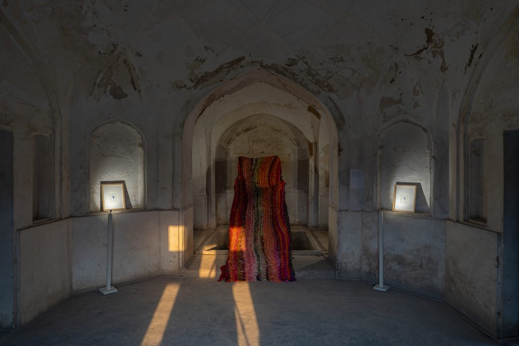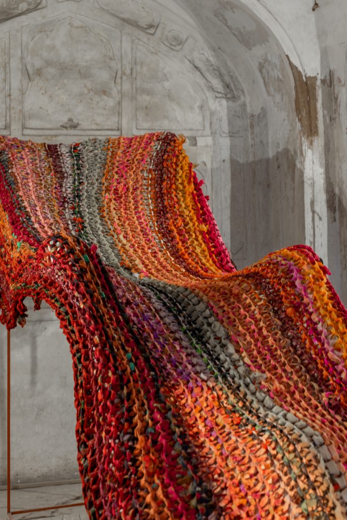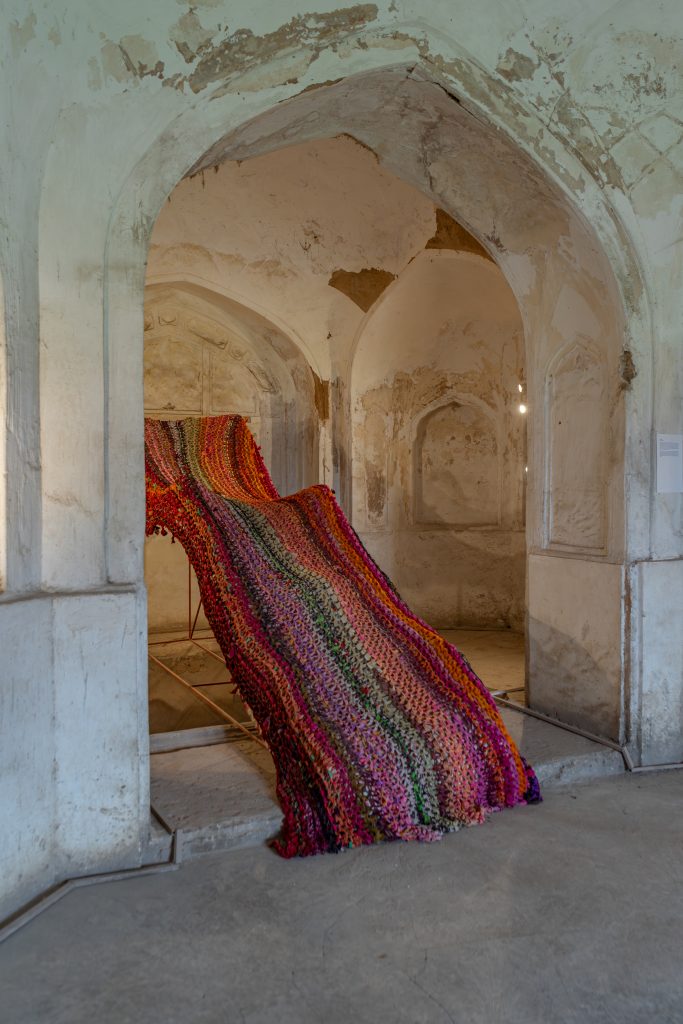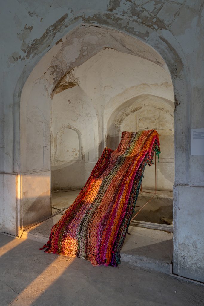 Meanwhile, Singh’s River of Sweat beckons beautifully in the Mughal splendor of Shalimar Garden Hammam, its weave a marvel of technique and painstaking labor. At the same time, its colorful strands have been constituted together from recycled sarees that would have otherwise ended up as landfill. The piece stands as a reminder of costs of fast fashion, the world’s second-largest polluting industry, for both the environment and craftspeople. In an era of insatiable consumerism, that garments, however beguiling, can entail what the artist has deemed a “river of blood, sweat, and tears.”