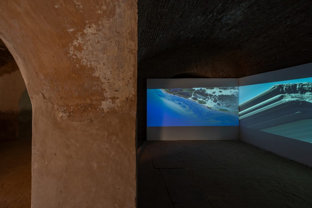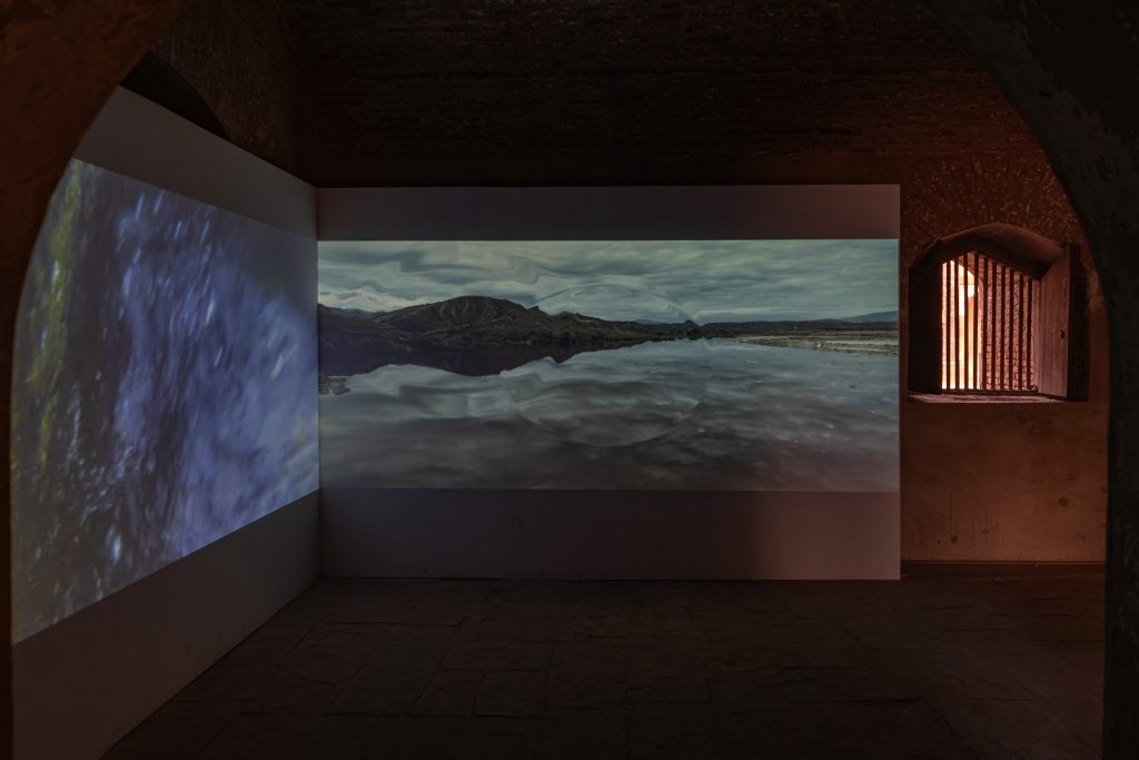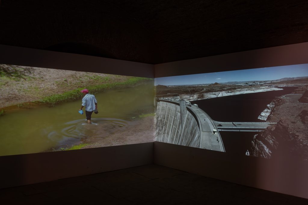 Weaving footage from diverse hydrographies such as the Colorado, the Yaqui, the Xingu, the Spree, and the Magdalena Rivers, Carolina Caycedo’s To Stop Being a Threat and to Become a Promise (2017) contrasts the ancestral and rural ‘campesino’ lifestyle found throughout the Americas with extractivist approaches to water and land by juxtaposing encountered perspectives and understandings of what territory is, and how it may be inhabited. Over the course of the video, the ancestral view casts a visual spell on the extractive one, making it wobble, shake, unfold, and eventually transform it into a spiritual vision.