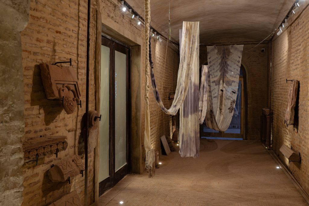 An extended fabric installation, Mesa Ritual Chola Body Story, is based on the artist’s own medical experiences. Taking as its point of departure the medical gauze that was ever-present during the artist’s experience with chemotherapy, the artist employs a reticular weaving technique similar to the openwork of indigenous gauzes, which the pre-Incan Chancay society believed to have healing and protection powers, to rewrite her own experiences of skin cancer, a condition that spanned almost half her life. By pulling out existing threads and inserting new lines and knots, the artist embeds new patches of energy fields into the internal body of the textile. Flores Pescorán further dyes the fibers with maiz morado, the purple corn indigenous to the Andes, and which she consumes for its restorative properties, and also as a reminder of home.  By bringing together pre-Hispanic weaving and dyeing, indigenous knowledge of plants, and shamanic healing, Flores Pescorán’s ritual altar (mesa ritual) invites us to reflect and rethink what we understand by medicine, illness, death and regeneration from a feminist and decolonial, yet deeply personal, perspective.