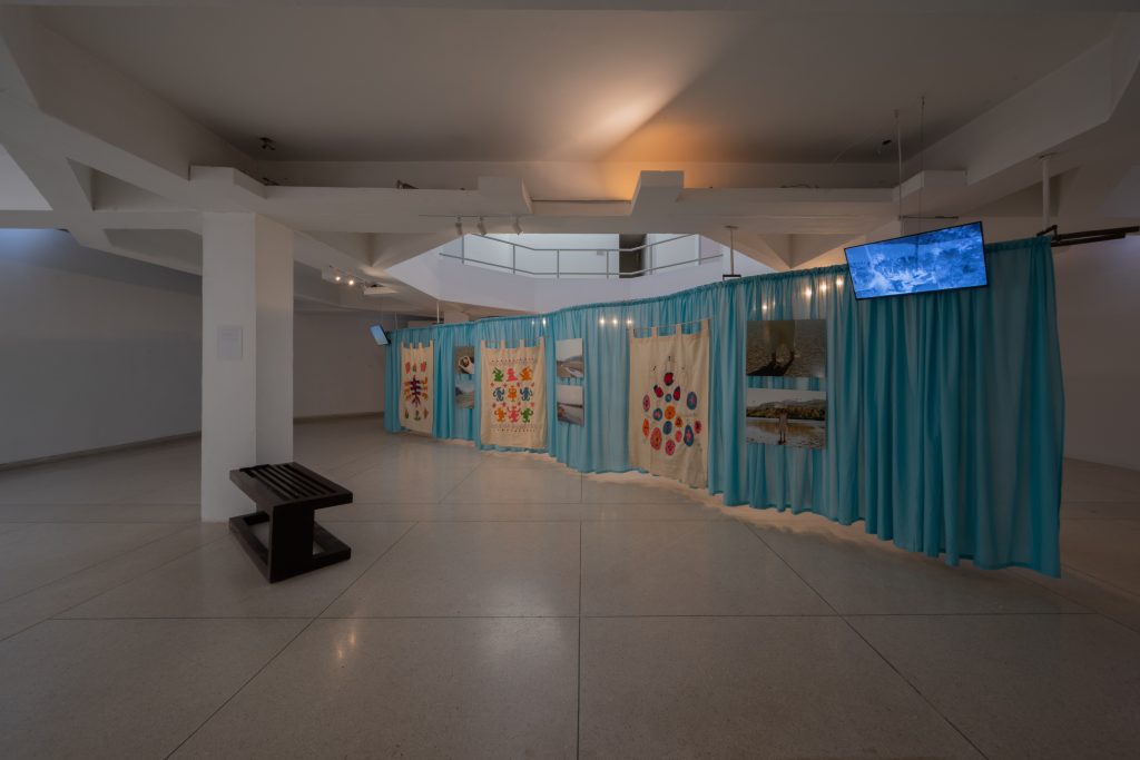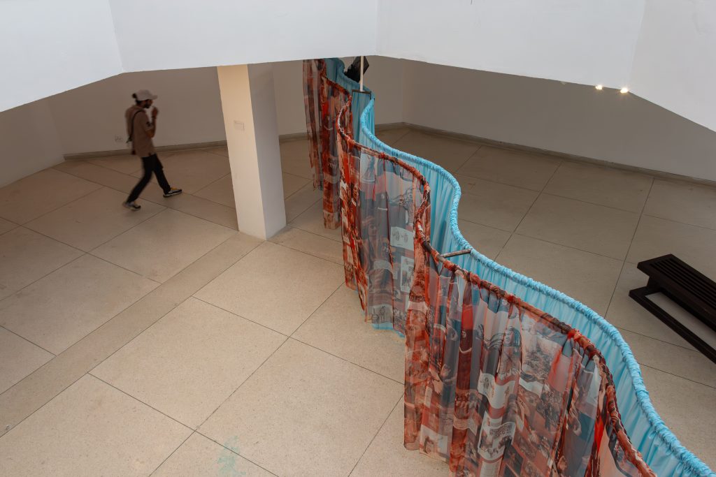 پرنٹ شدہ فیبرک، آرکائیو فلموں، کڑھائیوں، تصاویر، ڈرائنگ کے ساتھ ملٹی میڈیا تنصیب
