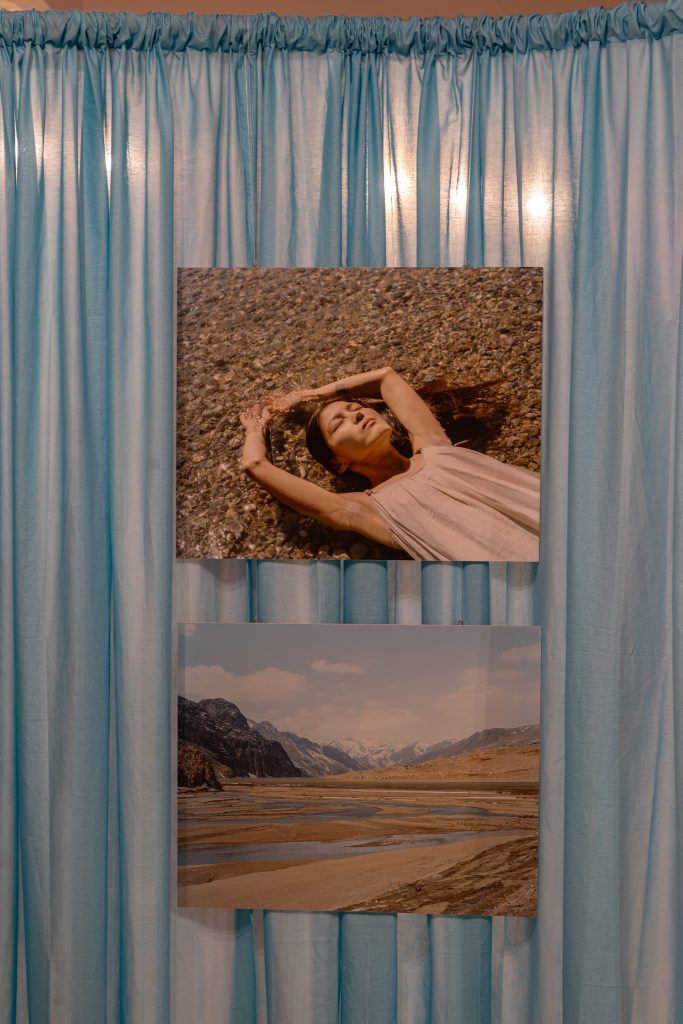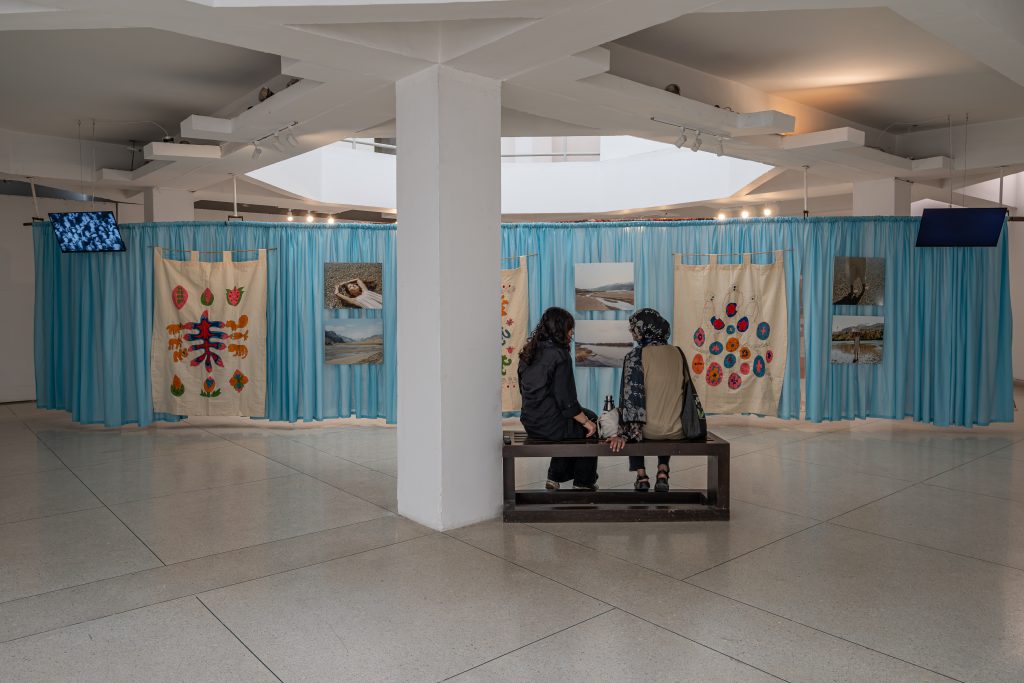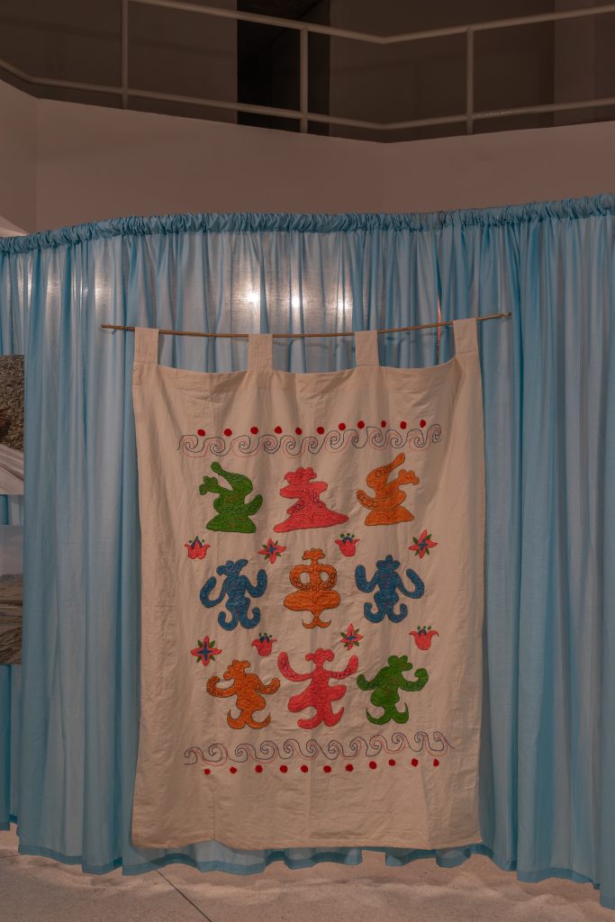 The installation historicizes the intersectional exploitation of the natural resources and women recruited for the Soviet workforce. Hanging from a meandering line recalling the flow of the Syr Darya river, a fabric imprinted with archival photographs showing the sheer scale and enduring legacy of women’s labor and the continuous significance of cotton production in the country’s agricultural landscape. On the other side of the curtain, archival footage shows the construction of the canal and the Cotton Dance, which was performed by women to motivate construction workers, while embroideries, color photographs, and drawings imagine other relations between water, women, dance, and cotton.