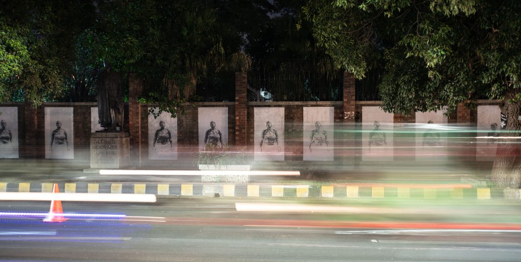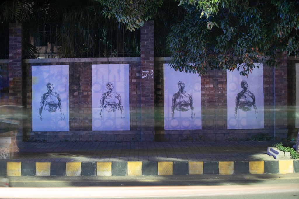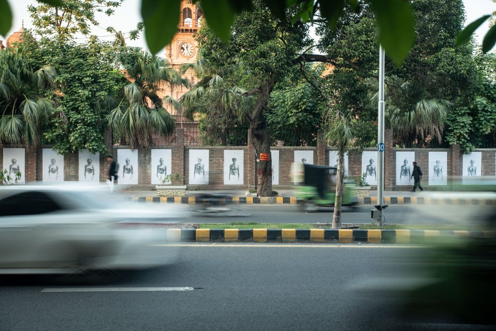 Breathe: Lahore builds on the public art strategies of Dryden Goodwin’s Breathe, begun in 2012 as a campaign for clean air, in a city often rated as having the worst pollution in the world.  At the heart of the project are thousands of minutely-realized sketches of different individuals, six to date, whose lives have been impacted by air pollution.  This includes Rosamund Adoo-Kissi-Debrah CBE, who established the Ella Roberta Foundation after her daughter became the first person for whom air pollution was listed as a cause for death.  For Lahore, Goodwin depicts Abid Omer, founder of Pakistan Air Quality Initiative (PAQI پاکی), which since 2016 has advocated for citizen-led actions against air pollution across the nation.  Blown up as sequences of street posters or on digital billboards as animations, the drawings of these campaigners inhaling and exhaling laboriously and literally “fighting for breath” make clear the need for clean air as a basic human right.  This issue is especially urgent in Pakistani cities, which face significant challenges from air pollution due to rapid urbanization and a high concentration of vehicles, made worse by smoke from crop-burning, brick kilns, and the burning of biomass and solid fuels for cooking and heating.