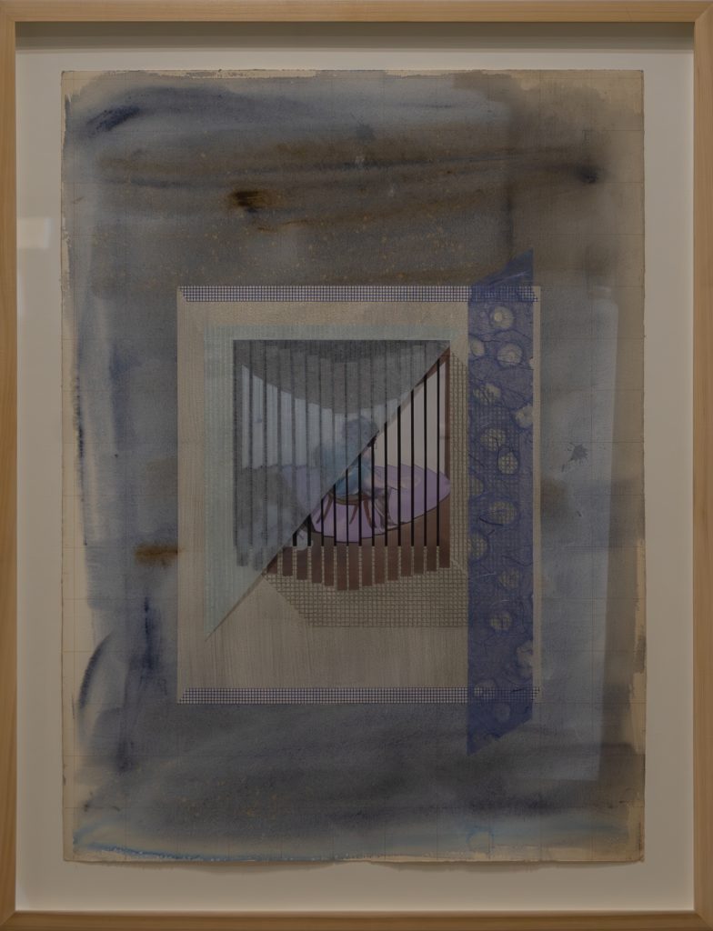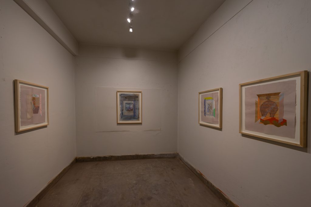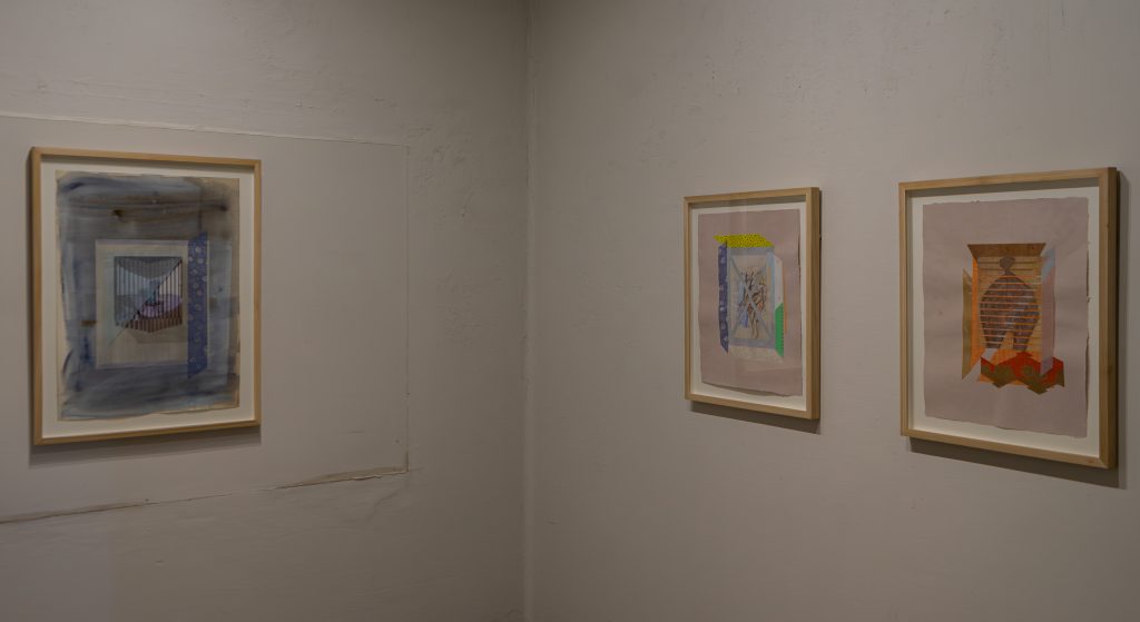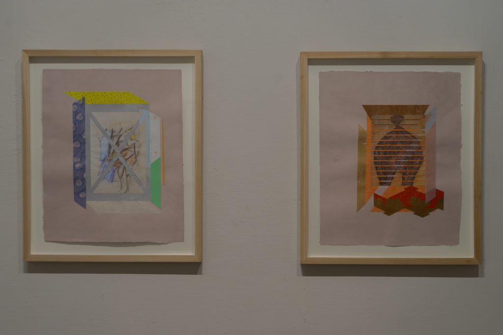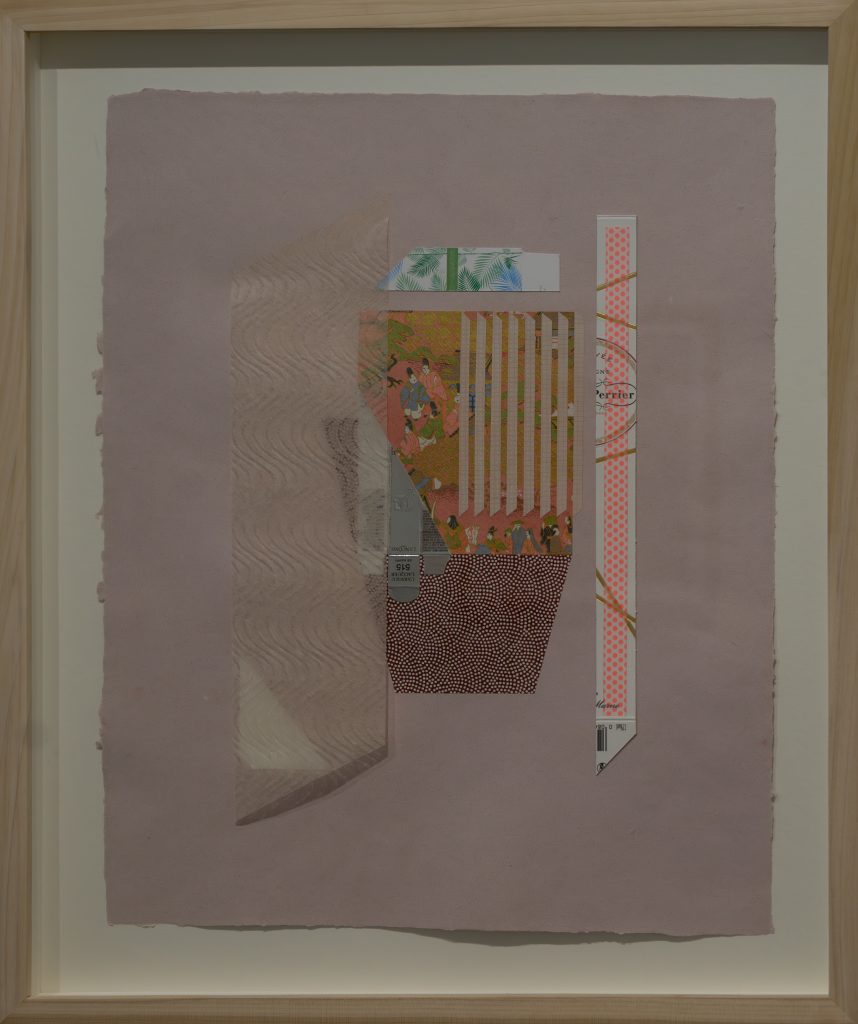 Nurjahan Akhlaq’s understated works on paper, referencing Japanese court imagery and modernist painters such as Francis Bacon, make use of the collage technique of making use of found and existing imagery materials. But the artist does collage one better. For Lasting Impressions, she used a blank but prepared sheet of wasli paper found in the studio of her father, the renowned artist Zahoor ul Akhlaq, as the support. Meanwhile, for the three works in the Chambers of the Heart series, she pulped clothes left by her recently-deceased mother, well-known ceramicist Sheherezade Alam, into paper. In doing so, the artist takes part in the traditional practices of repurposing old clothes for things such as ralli patchwork quilts or batwa satchels, as a way of extending their life.