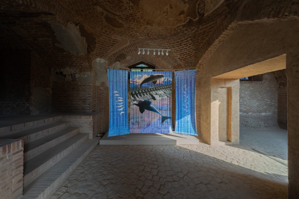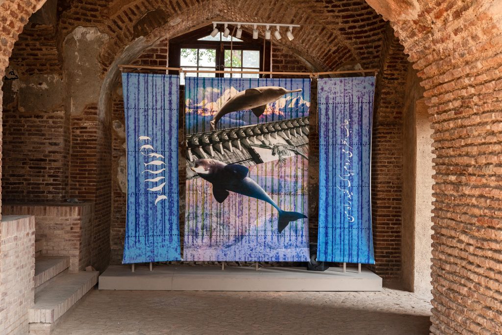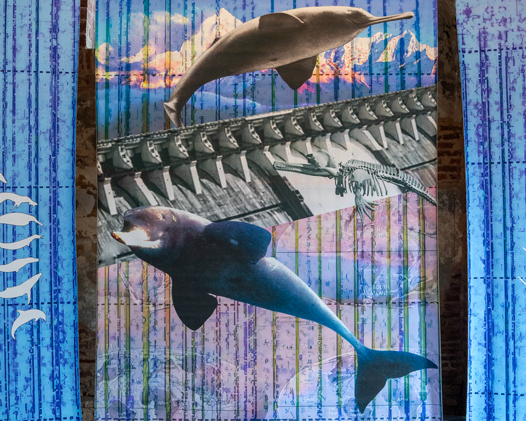Alongside the larger-than-life banner, which shows the dolphins frolicking in a dammed waterway, Agarwal presents a sonic element pairing the dolphins’ echolocation clicks with a recital of Rūmī’s verses: