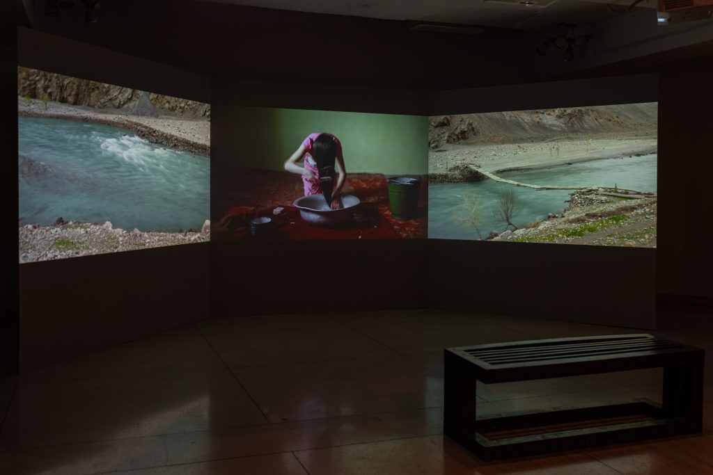Stains of Oxus takes viewers on a journey along the greatest Central Asian River, the Amu Darya – known from Greek times as the Oxus – from its birth in icy Tajikistan to its death in the Aral Sea in Uzbekistan, now largely a desert. Along the way, the viewer encounters people who share their dreams of the river, and to whom whispering one’s thoughts and dreams to its waters is a morning ritual and an ancient local tradition. Ismailova’s installation locates the poetics of water at the critical intersection of hydropolitics and the politics of memory, suggesting the ways that ecological disaster also means cultural loss.