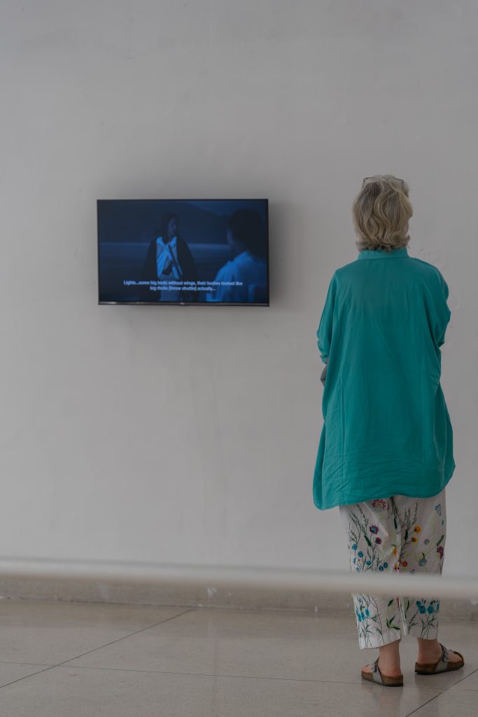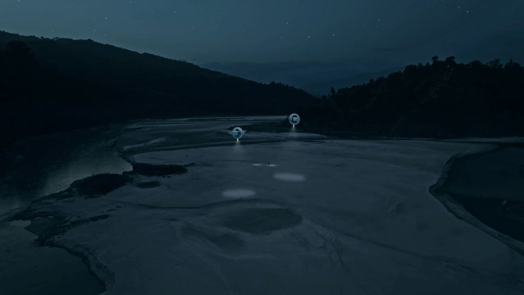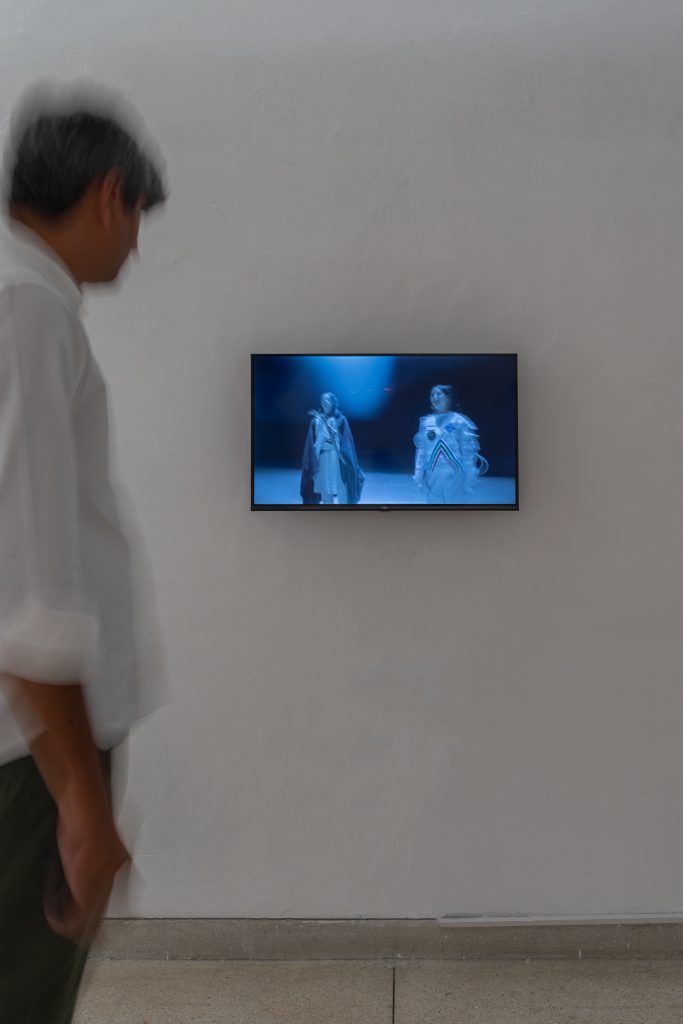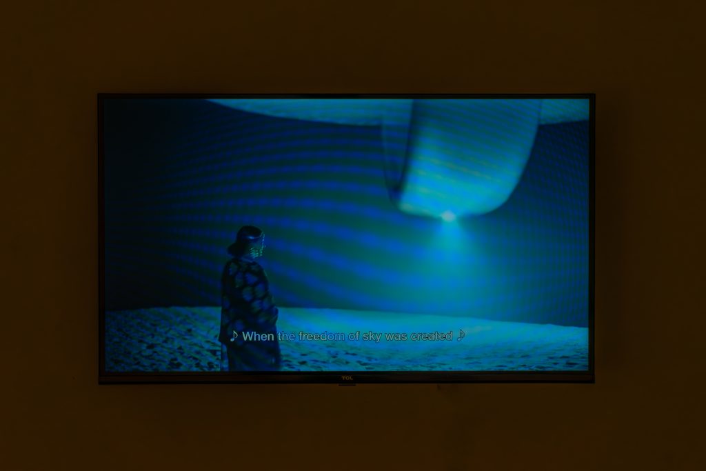 The title of the work Ladhamba Tayem; Future Continuous borrows from a verbal inflection that specifies time of action or state where ‘Tayem’ is future and ‘Ladhamba’ is continuous in the artist’s native language. Filmed in the Himalayas, the film follows a conversation between two indigenous figures from different historical timelines, the first an 18th century Yakthung warrior called Kangsore fighting the colonial army, and the other an astronaut and time traveler from the distant future. They discuss the space-time continuum from their perspectives, and in doing so, ask the viewers—who exist between the past and future—to investigate their own relationship to time. The space-time traveler prophesies what the future could look like, while the warrior reminds us of the continued struggle against colonialism and struggles we shall overcome.