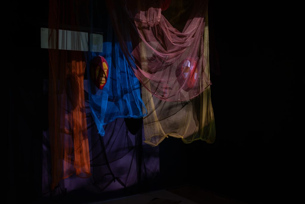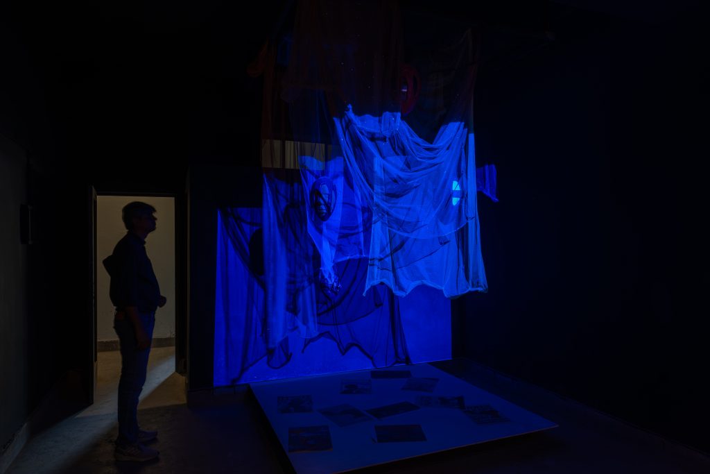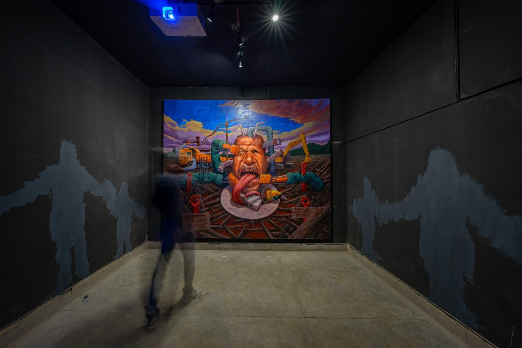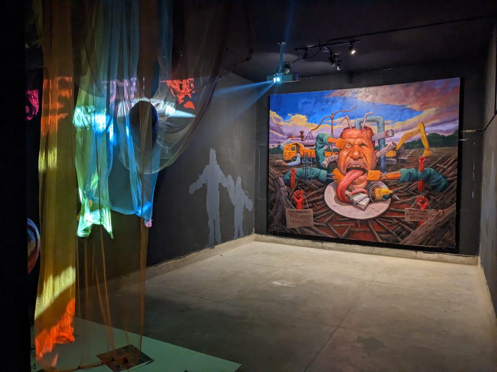 Koreri Projection is a two-part installation comprising a mural-size painting and a ceiling projection that shines through bark and hanging banners onto found objects and the room itself. On entering the space, viewers are immediately confronted by the large canvas that makes clear the threats that neocolonial expansion and extractivism pose to the flora, fauna, and indigenous peoples of West Papua, as the Indonesian targeting of its easternmost region for development has results in massive deforestation and loss of customary lands. At the same time, with the projection, it is Udeido’s intention that Koreri, meaning “a new life/a life full of peace” in the Papuan language, also the name of the Papuan independence movement in the 1930-40s, will be projected on the land of Lahore. Through a participatory approach, the artists who installed the work as well as viewers alike will leave temporary shadows and traces in the installation, symbols that represent emotional attachments but also the existence and identity of a people.