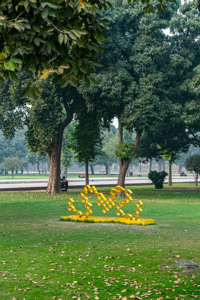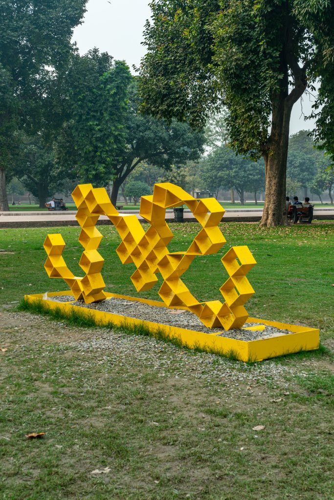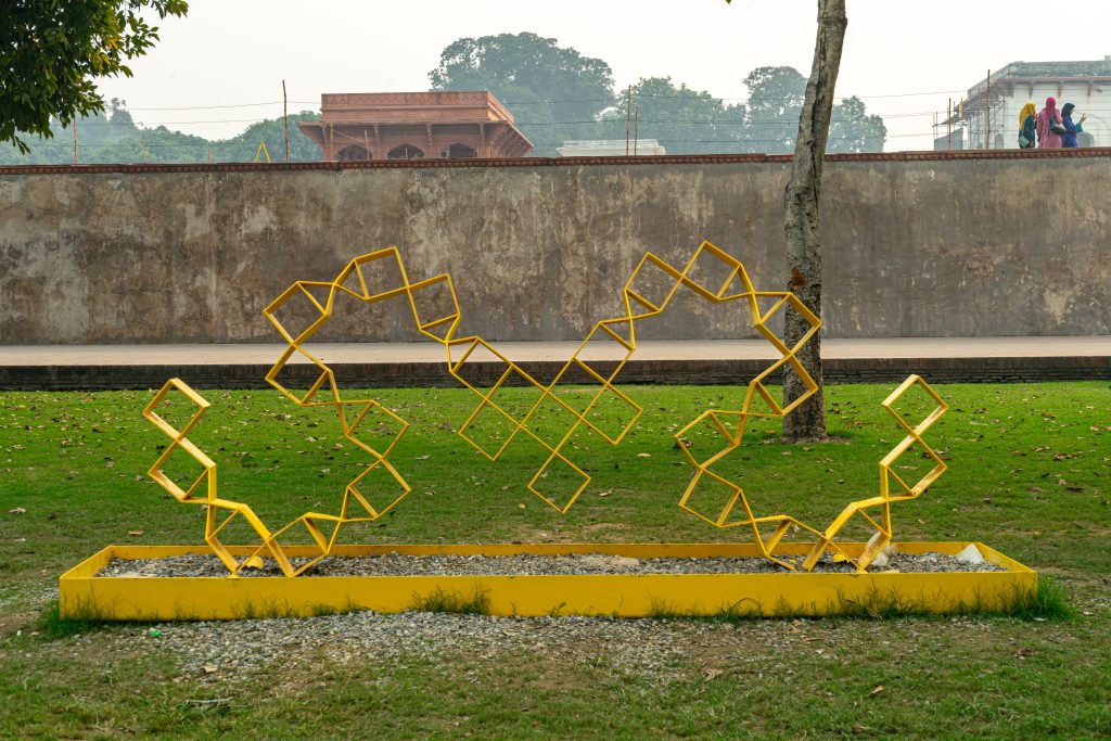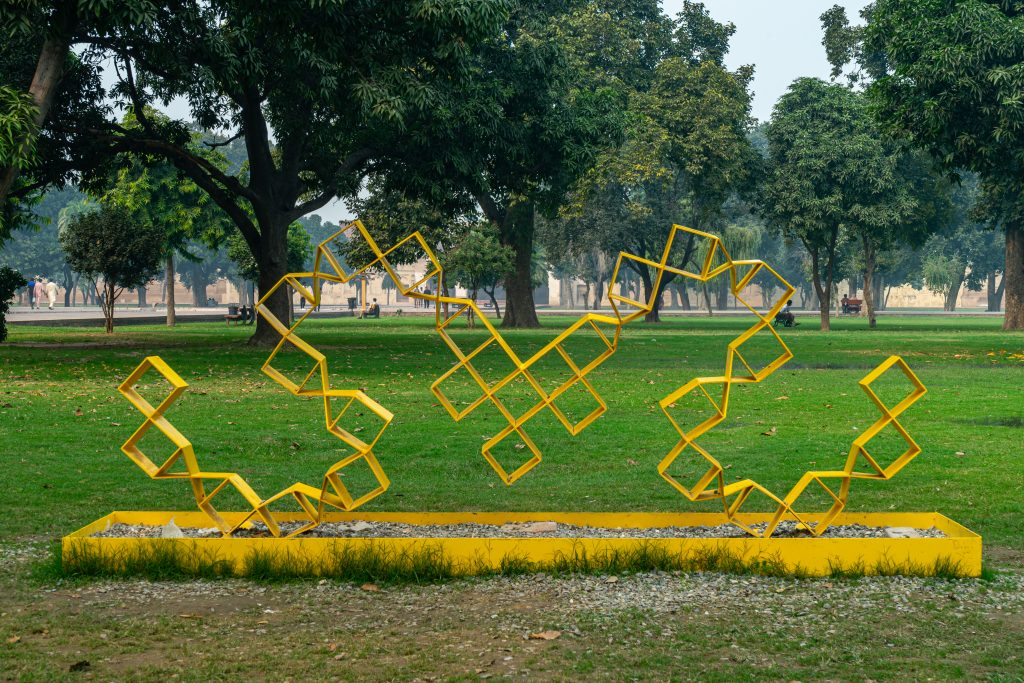 Akhlaq is best known for his paintings and works on paintings, which drew on modernism and Mughal miniature painting in equal measure, and which laid the ground for an influential trajectory of contemporary practice by subsequent artists.  His melding of tradition and innovation can also be seen in his lesser-known sculptural public artworks, which cannily employ geometry as the vocabulary of both historical Islamic aesthetics and modern abstraction.  His Markhor represents the country’s national animal as a design composed of diamond-shaped units, with the goat’s distinctive screw horns stylized as symmetrical arabesques.  The piece testifies to Akhlaq’s abiding concern for the country’s distinctive built and natural environment.