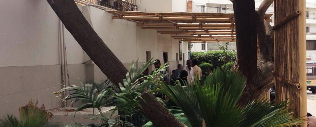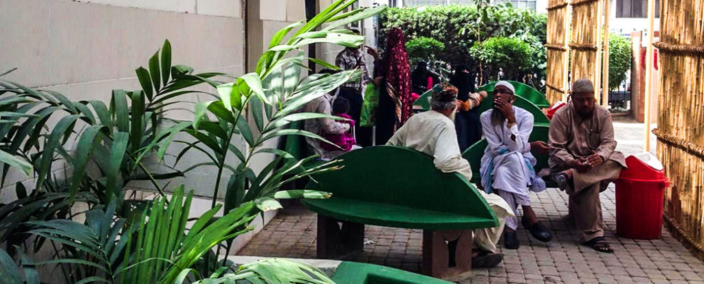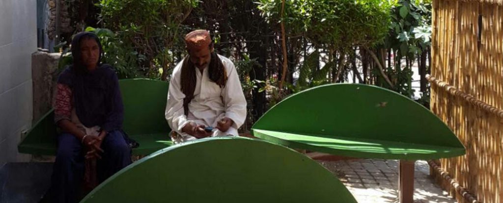 A collaboration between the Lahore Biennale Foundation (LBF) and the Patients’ Aid Foundation (PAF), Karachi, Innovations in Public Space was the first ever project implemented by the foundation in the city of Karachi. LBF seeks to encourage creative, community-centric approaches to public interventions; the design of an outdoor waiting area at the Jinnah Postgraduate Medical Centre (JPMC) by artists Naima Dadabhoy and Roohi Ahmed makes manifest one of the many aims of the foundation.