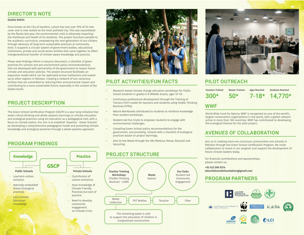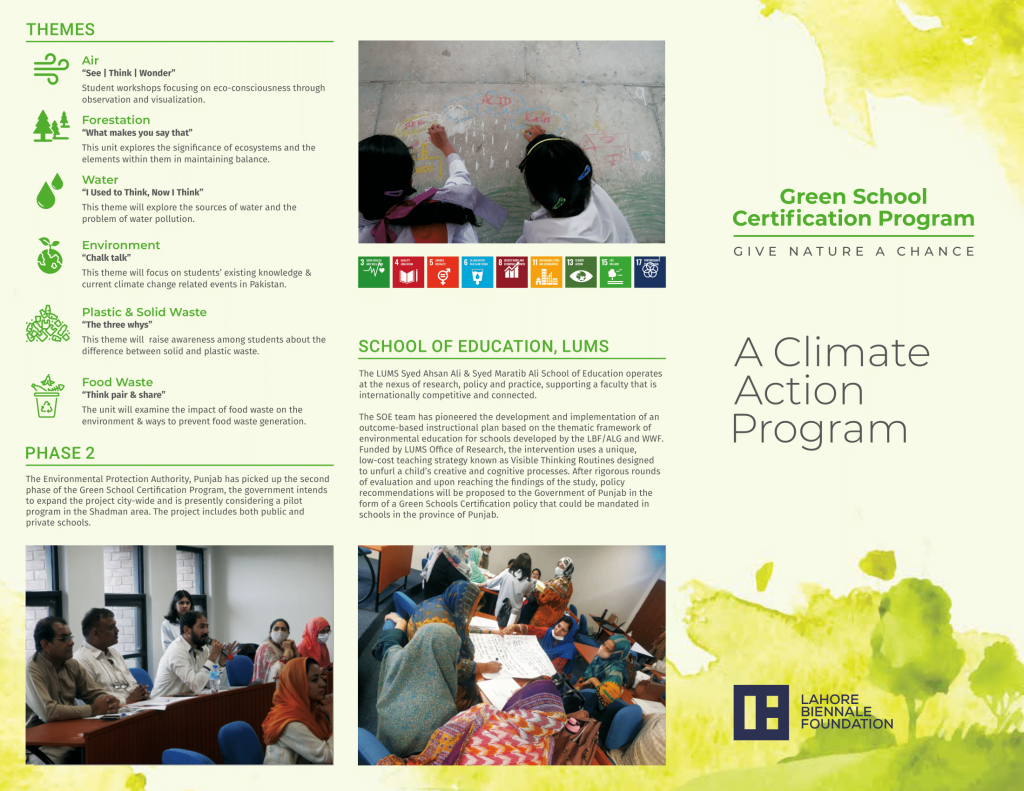 The Environmental Protection Authority, Punjab has picked up the second phase of the Green School Certification Program, the government intends to expand the project city-wide and is presently considering a pilot program in the Shadman area. The project includes both public and private schools.