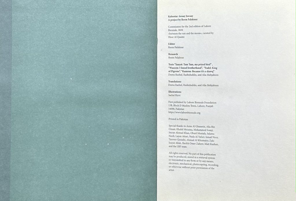 Texts: “Inayat: Tam Tam, my prized bird”, “Waseem: I found brotherhood”, “Fadel: King of Pigeons”, “Kamran: Because it’s a shawq” – Deena Rashid, Rashiduddin, and Alia Mehjabeen