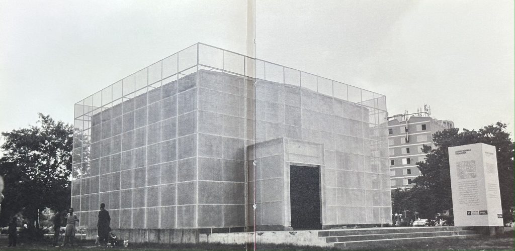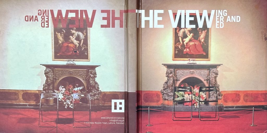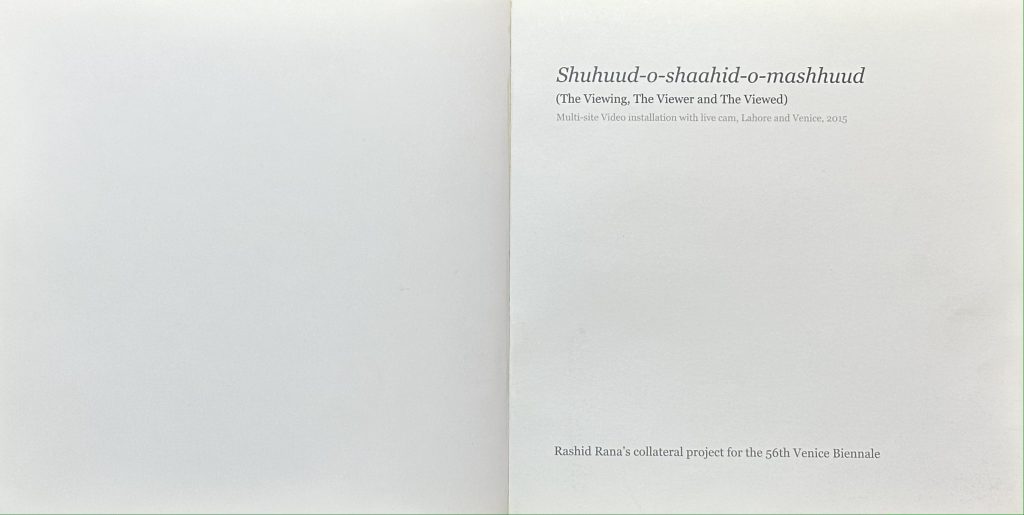 A publication outlining a component of My East is Your West – an installation by Rashid Rana, entitled Shuhuud-o-shaahid-o-mashhuud (The Viewing, The Viewer and The Viewed). This project was a multi-site video installation with a live camera that created two simultaneous mirrored spaces, connecting audiences in Venice, Italy with audiences in Liberty Market Horse Shoe, Lahore via a live feed. In doing so, it blurred the lines between the East and West, and between the audience and art. The audience was as much a part of the artwork as they were witness to it. The room built in Liberty Market, Lahore, was made in collaboration with the Lahore Biennale Foundation.